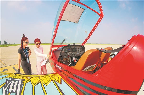 8月24日,在位于山東萊西市店埠鎮(zhèn)的青島萊西通航產(chǎn)業(yè)園,飛行教員梁婷婷(右)和飛行學員陳瑩瑩做航前繞機檢查。
