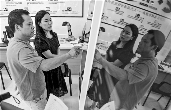 8月20日,湖南省永州市道縣零工市場(chǎng)秋季招聘會(huì)上,求職者在工作人員協(xié)助下在自助服務(wù)一體機(jī)上查詢(xún)招聘信息。