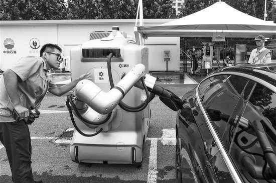 8月19日,中國(guó)石油北投冬奧村超級(jí)充電港,移動(dòng)充電機(jī)器人正在給一輛新能源汽車充電。
