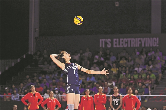 中國隊球員王媛媛在比賽中發(fā)球。新華社記者 孫瑋彤 攝