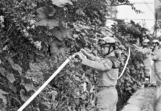 日前,搶險(xiǎn)救災(zāi)人員在重慶市彭水縣太原鎮(zhèn)區(qū)陽(yáng)村一處地災(zāi)風(fēng)險(xiǎn)點(diǎn)拉起警戒線。新華社記者 王全超 攝