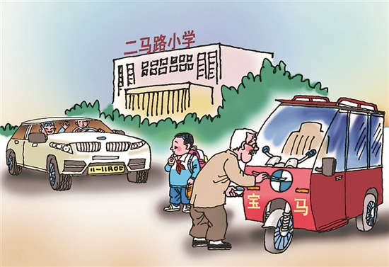 在漫畫家劉二勵筆下,就有這樣一名小朋友,面對同學家的豪車,他羞愧難當,不知所措,以致難為了他的爺爺。而爺爺畢竟見多識廣,畢竟經歷過無數(shù)窘境,他沒有被難堪征服,他利用自己手中的畫筆,“創(chuàng)造”性、“零成本”地將接送孫子的三輪摩托頃刻間“升級”為私人訂制版名車。