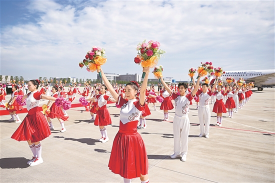 8月30日,工作人員在天津濱海國際機(jī)場迎接參加峰會的嘉賓。