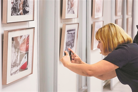 圖為近日在俄羅斯圣彼得堡,一名女子參觀紀念中國人民抗日戰(zhàn)爭暨世界反法西斯戰(zhàn)爭勝利80周年圖片展。