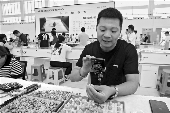 8月30日,一位主播在湖北省竹山縣中國(guó)綠松石交易中心內(nèi)為綠松石產(chǎn)品做直播。