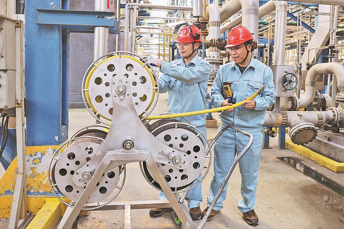 揚(yáng)子石化烷基化車間自主設(shè)計(jì)制作公用工程膠管收納萬(wàn)向小推車,實(shí)現(xiàn)了多根軟管膠管整齊有序“歸位”,有效提升了現(xiàn)場(chǎng)作業(yè)效率。圖為班組管理人員對(duì)膠管整理歸位。李樹鵬 攝