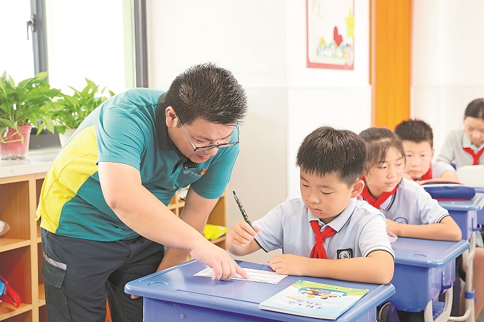 9月1日,江蘇省昆山市勞動模范、郵政快遞員陳衛(wèi)華走進(jìn)昆山市信義小學(xué),分享勞動故事,教五年級的孩子填寫快遞單。