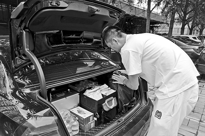 王震的汽車后備箱,總是裝得滿滿當(dāng)當(dāng)?shù)摹I睇}水、注射器、胃管、導(dǎo)尿包……凡是醫(yī)療護(hù)理中常用的耗材,在那里面基本都能找得到。