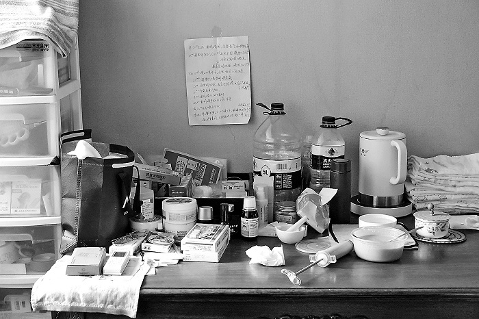 說這些話時(shí),謝阿姨語氣中沒有一絲波瀾。和許多有失能病人的家庭一樣,臥室里,謝阿姨的床邊就是母親的護(hù)理床,窗臺(tái)、床頭柜、桌子上擺滿了護(hù)理老人時(shí)要用到的各種物品。此前一夜,為了給母親物理降溫,謝阿姨幾乎一宿沒合眼。