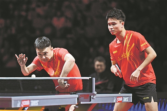 山東魏橋·向尚運動隊組合于子洋(左)/周啟豪在比賽中。他們在雙打比賽中3比0戰(zhàn)勝黃石華新隊組合劉冠成/胡暢。新華社記者 丁磊 攝