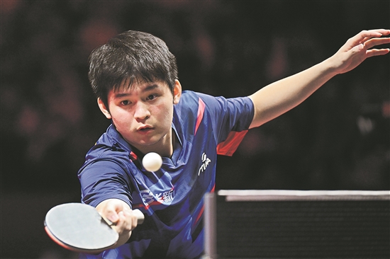 黃石華新隊選手林詩棟在比賽中回球。他在單打比賽中3比0戰(zhàn)勝先鋒乒羽陳靜隊選手費浚航。新華社記者 丁磊 攝
