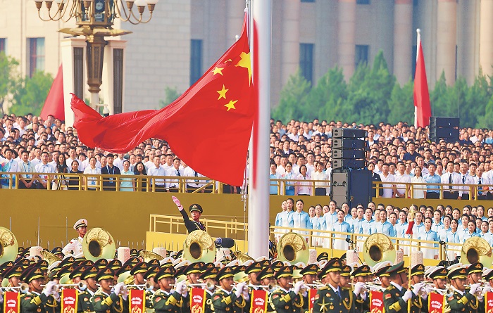9月3日,紀(jì)念中國(guó)人民抗日戰(zhàn)爭(zhēng)暨世界反法西斯戰(zhàn)爭(zhēng)勝利80周年大會(huì)在北京隆重舉行。這是北京天安門(mén)廣場(chǎng)的升國(guó)旗儀式。本報(bào)記者 蔚可任 攝