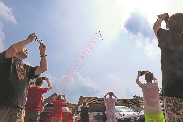 北京市西城區(qū)北新平胡同,市民和游客用手機(jī)記錄空中梯隊(duì)飛過(guò)上空。本報(bào)記者 吳凡 攝