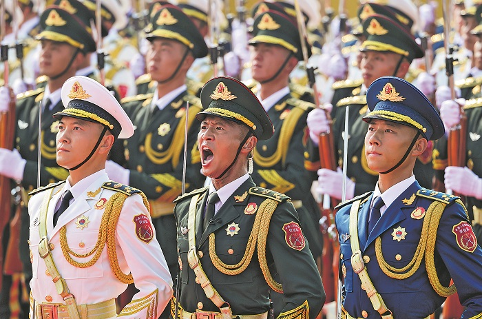 “同志們好!”、“主席好!”統(tǒng)帥的親切問(wèn)候飽含鼓舞激勵(lì),官兵的響亮回答充滿(mǎn)力量底氣。和平之師、正義之師、威武之師、勝利之師雄姿英發(fā)。