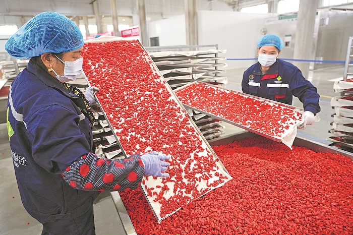 9月4日,青海省格爾木農(nóng)墾集團(tuán)枸杞生產(chǎn)線,工人們正在收集采用鎖鮮工藝烘干的枸杞。