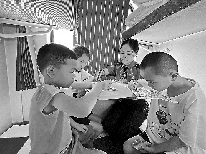 暑假結束,大量兒童乘客踏上返程,中國鐵路呼和浩特局集團有限公司包頭客運段杭州車隊開展“安全相伴,快樂‘童’行”活動。列車上,列車員孔祥瑞化身“安全導師”,耐心為小旅客講解安全知識卡片,展示鐵路安全小報,傳遞安全理念,助力兒童平安快樂出行,彰顯鐵路人的責任與溫度。