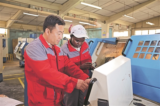 由中航科創(chuàng)有限公司、肯尼亞教育部和中國教育國際交流協(xié)會聯(lián)合主辦的第十屆非洲職業(yè)技能挑戰(zhàn)賽閉幕式暨頒獎儀式近日在肯尼亞首都內(nèi)羅畢舉行。自7月28日開幕以來,賽事吸引了來自肯尼亞、埃及、科特迪瓦、加蓬等12個國家的142支隊伍參與角逐。圖為近日,在位于肯尼亞首都內(nèi)羅畢的肯尼亞科技大學(xué),中方指導(dǎo)老師與第十屆非洲職業(yè)技能挑戰(zhàn)賽的參賽選手在數(shù)控車床前交流。新華社記者 楊光 攝