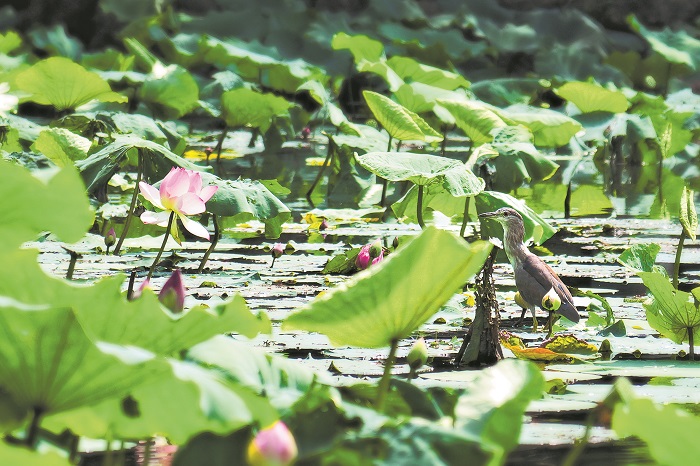 8月25日,江蘇南京莫愁湖公園。荷塘里,鷺鳥棲荷,靜候魚蹤,在漸起的秋意中凝望最后一抹夏韻。本報(bào)記者 劉金夢(mèng) 攝