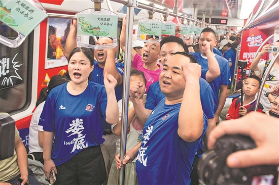9月7日晚,湖南省足球聯(lián)賽(簡稱“湘超”)揭幕戰(zhàn)在長沙市賀龍體育中心打響,由婁底隊客場挑戰(zhàn)長沙隊。當天,不少球迷乘坐主題為“婁底號”的地鐵前往觀賽。這列地鐵不僅是一種交通工具,更是婁底市向全省發(fā)出的一張“邀請函”。