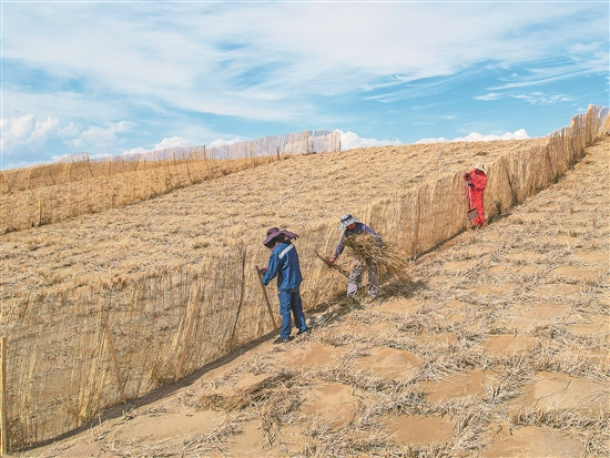 近日,甘肅省酒泉市金塔縣黑河中游防沙治沙林草綜合治理項目工程固沙現(xiàn)場,治沙工人正在起伏的沙丘上鋪設草方格沙障、搭建高立式沙障。