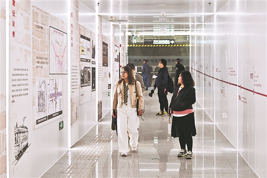 10月10日,地鐵乘客在天津衛(wèi)故城東城墻遺址文物展廳內(nèi)參觀。