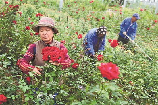 10月9日,內(nèi)蒙古自治區(qū)鄂爾多斯市達(dá)拉特旗恩格貝示范區(qū),農(nóng)業(yè)技術(shù)員劉雪芹(左一)正和工作人員采摘月季花。