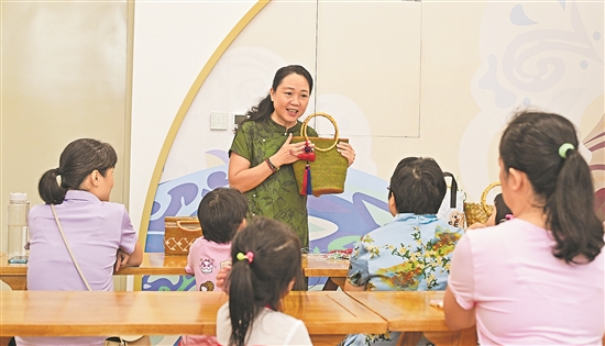 10月12日,在海南省文化館,東山草編技藝傳承人袁潔(后)為家長和小朋友講解東山草編技藝。