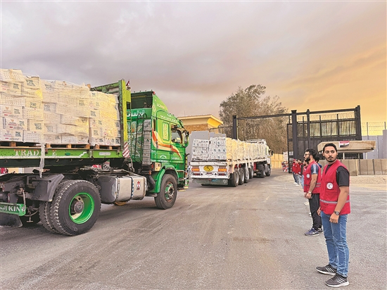 根據(jù)埃及總統(tǒng)府發(fā)表的聲明,埃及已在加沙?;鸬谝浑A段協(xié)議達成后立即開始向加沙地帶運送緊急糧食和醫(yī)療援助物資。圖為當(dāng)?shù)貢r間10月12日,載有人道主義援助物資的卡車在埃及紅新月會工作人員的監(jiān)督下從拉法口岸埃及一側(cè)駛向加沙。新華社發(fā)(阿里·穆斯塔法 攝)