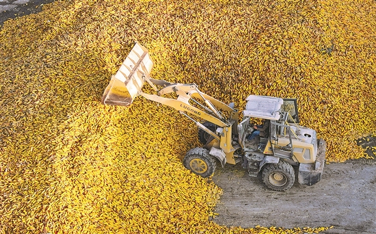 10月13日,河南省洛陽市汝陽縣內(nèi)埠鎮(zhèn)內(nèi)埠村汝陽尚誠糧食專業(yè)合作社的工作人員在堆放收購的玉米(無人機照片)。