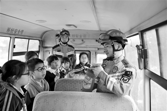 10月13日,在江蘇省淮安市洪澤第二實驗小學,消防員為學生講解校車內(nèi)滅火器使用知識,以提高學生們的應急避險與安全自救能力。