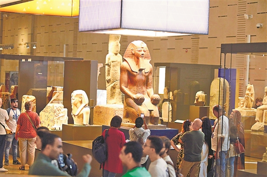 位于埃及吉薩省的大埃及博物館于當?shù)貢r間10月15日起暫時關(guān)閉,為11月正式開放做準備。該博物館位于埃及吉薩金字塔景區(qū)附近,占地超過50萬平方米,可容納超10萬件文物。圖為近日游客在大埃及博物館參觀。