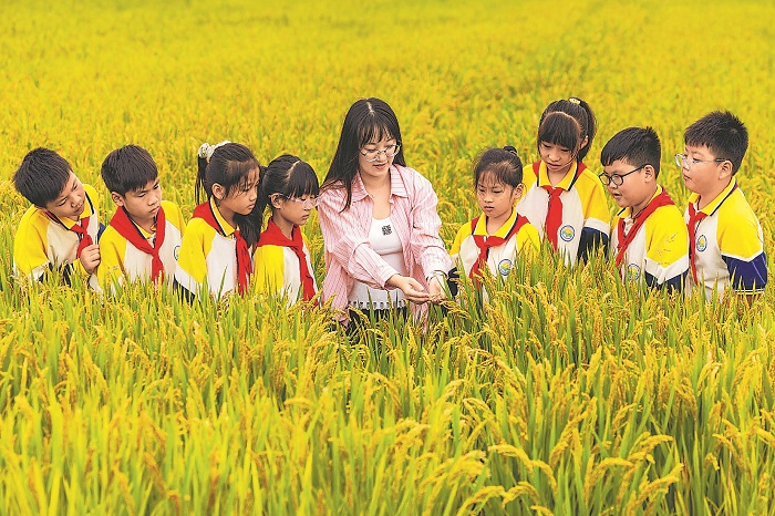 當日是世界糧食日,泰州市海陵區(qū)九龍實驗學校通過組織學生走進水稻田,近距離觀察水稻、體驗秋收場景、學習糧食知識等多種多樣的活動,培養(yǎng)孩子們愛惜和節(jié)約糧食的意識。本報通訊員 湯德宏 朱美雯 攝