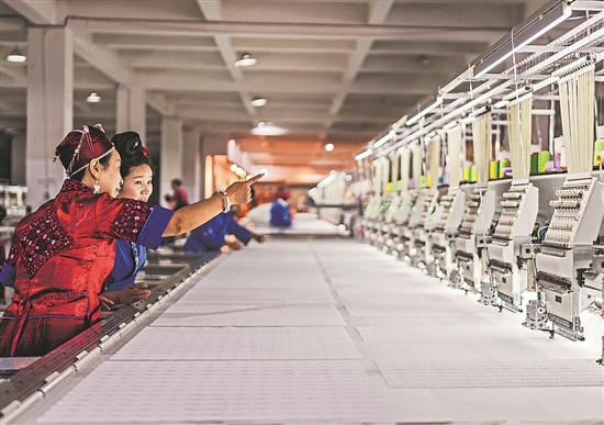 近年來,龍祿穎致力于探索苗繡的創(chuàng)造性轉化應用。她投入智能化苗繡生產設備,生產苗家風格的繡品,廣泛應用于墻布、掛畫、服裝等產品。婦女們用自己的雙手繡出了一片錦繡天地。