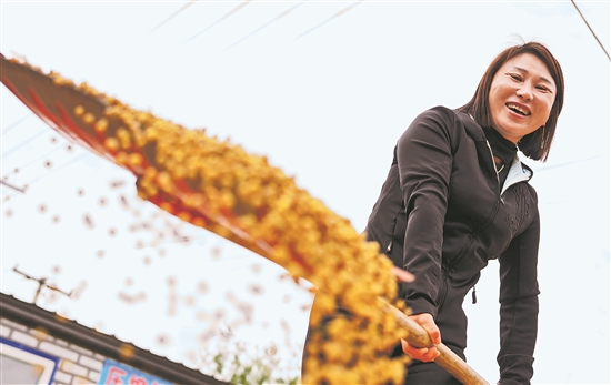 10月9日,韓鳳香在合作社內(nèi)晾曬剛剛收獲的大豆。