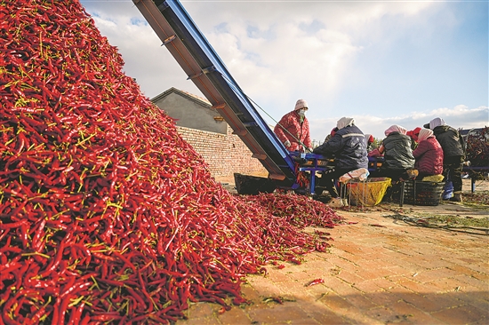 10月19日,在內蒙古通遼市開魯縣東風鎮(zhèn)六合堂村,村民在分揀紅干椒。
