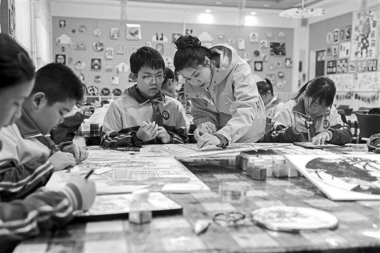 近日,內(nèi)蒙古自治區(qū)鄂爾多斯市達拉特旗第十一小學(xué),孩子們在課后時間跟隨老師制作掐絲琺瑯畫。近年來,當?shù)貫樯疃韧七M藝術(shù)課程與勞動課程的融合,美術(shù)教研組創(chuàng)新打造掐絲琺瑯畫校本課程,使學(xué)生在感受藝術(shù)美感的同時,也能體悟到學(xué)校以美塑心的追求。本報記者 王偉偉 攝