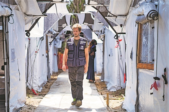 圖為近日一名世界衛(wèi)生組織的工作人員走在剛果(金)開賽省布拉佩衛(wèi)生區(qū)的埃博拉治療中心內(nèi)。