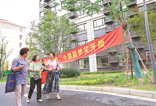 圖為居民行走在拆除重建后的談家橋小區(qū)內(nèi)。