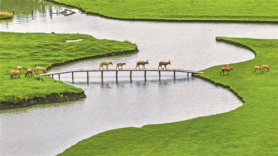 10月17日,在江蘇省泰州市姜堰區(qū)溱湖國家濕地公園,一群麋鹿通過獨木橋。