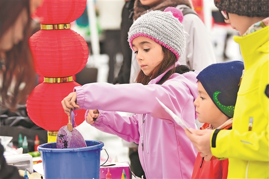 當(dāng)日,在瑞士首都伯爾尼,小朋友在“遇見中國”文化節(jié)上體驗制作漆扇。新華社記者 連漪 攝