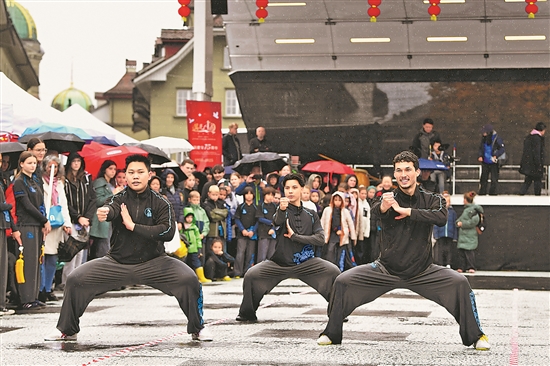 當(dāng)日,在瑞士首都伯爾尼,表演者在“遇見中國”文化節(jié)上展示中國武術(shù)。新華社記者 連漪 攝