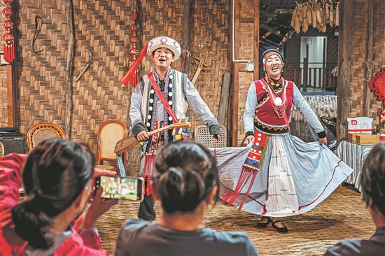 老姆登村村民曾關(guān)心(左)、李玉蘭在客棧里給游客表演民族歌舞。