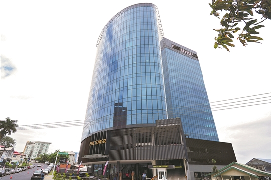 圖為近日在斐濟首都蘇瓦拍攝的由中國中鐵一局集團有限公司承建的斐濟首座綠色建筑——FHL大廈。