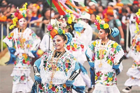 每年的11月1日和2日是墨西哥的傳統(tǒng)節(jié)日亡靈節(jié)。亡靈節(jié)是墨西哥最隆重、最獨特的節(jié)日之一,大批民眾走上街頭,慶祝這個崇敬生命的節(jié)日。圖為當?shù)貢r間11月1日,在墨西哥首都墨西哥城,演員參加亡靈節(jié)游行。