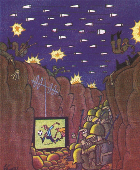 戰(zhàn)場(chǎng)上拼殺激烈,槍彈炮火呼嘯而過(guò),隱蔽在戰(zhàn)壕小息的士兵卻興致勃勃地觀看綠茵場(chǎng)上的角逐,足球的魅力就是如此之大。