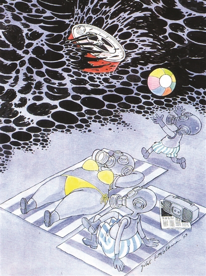 海洋環(huán)境遭到破壞,未來(lái)的沙灘再也不是人們消夏休閑的勝地,若來(lái)這里“度假”只能“全副武裝”啦!