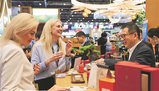 當(dāng)?shù)貢r(shí)間11月4日,兩名女子在2025倫敦世界旅游交易會(huì)中國(guó)展區(qū)品嘗中國(guó)茶。新華社記者 李穎 攝