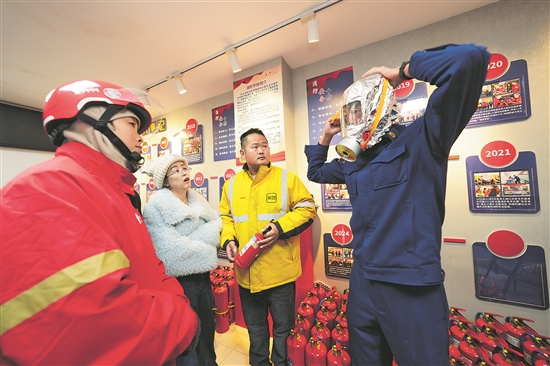 11月6日,一支由外賣配送員、快遞員、網約車司機等新業(yè)態(tài)群體與社區(qū)志愿者應急隊伍成員組成的“百安騎士”消防隊,在天津市和平區(qū)勸業(yè)場街百貨大樓社區(qū)成立。消防工作人員為他們現場培訓并為隊員發(fā)放便捷式滅火器,鼓勵他們成為社區(qū)治理的“移動探頭”。圖為消防工作人員為大家培訓。本報通訊員 沈岳 攝