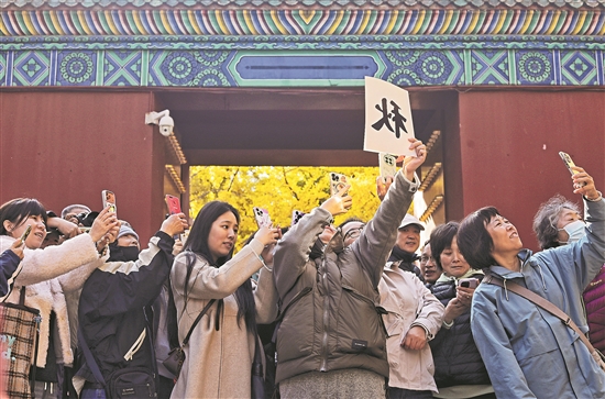 11月4日上午,北京地壇公園,游客在銀杏大道前拍照,用金黃銀杏葉填滿鏤空的“秋”字,留住北京最美的季節(jié)。時至深秋,北京各大公園呈現(xiàn)黃、橙、紅、綠疊加的多彩景色,彩葉樹種搭配園林古建、蘆葦殘荷、碧水遠山,共同形成歷史名園絢爛多彩的獨特秋季美景。