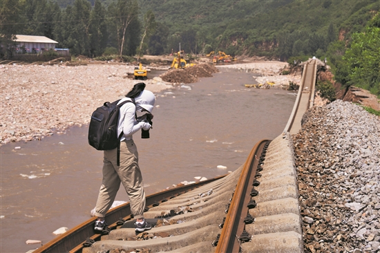 8月3日,京承鐵路部分路段因暴雨受損,《中國(guó)日?qǐng)?bào)》記者武曉慧在河北興隆鐵路受損段采訪。邢子鳴 攝